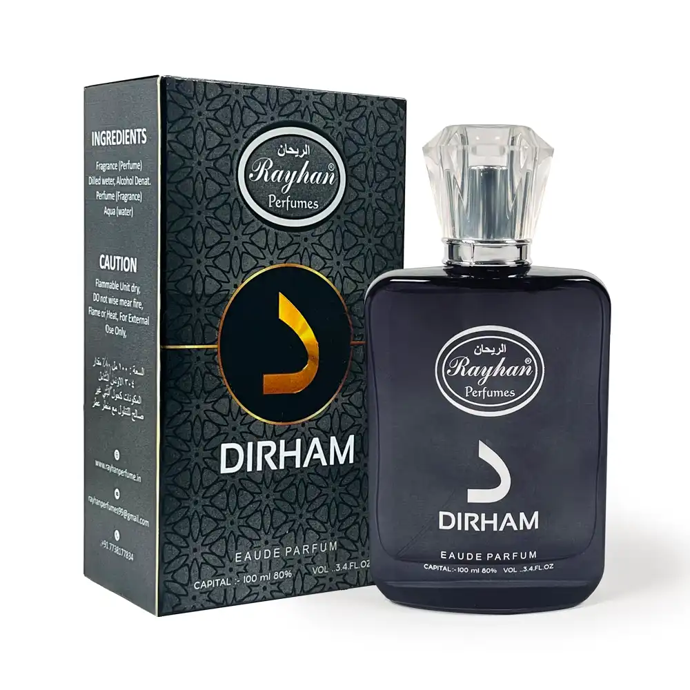 Dirham by Rayhaan Perfumes is a refined scent that balances freshness and depth with sophistication. Opening with vibrant citrus and green top notes, it transitions smoothly into a warm heart of florals and spices. The base is anchored in rich woody accords and soft musk, making it a perfect companion for the modern, confident individual.